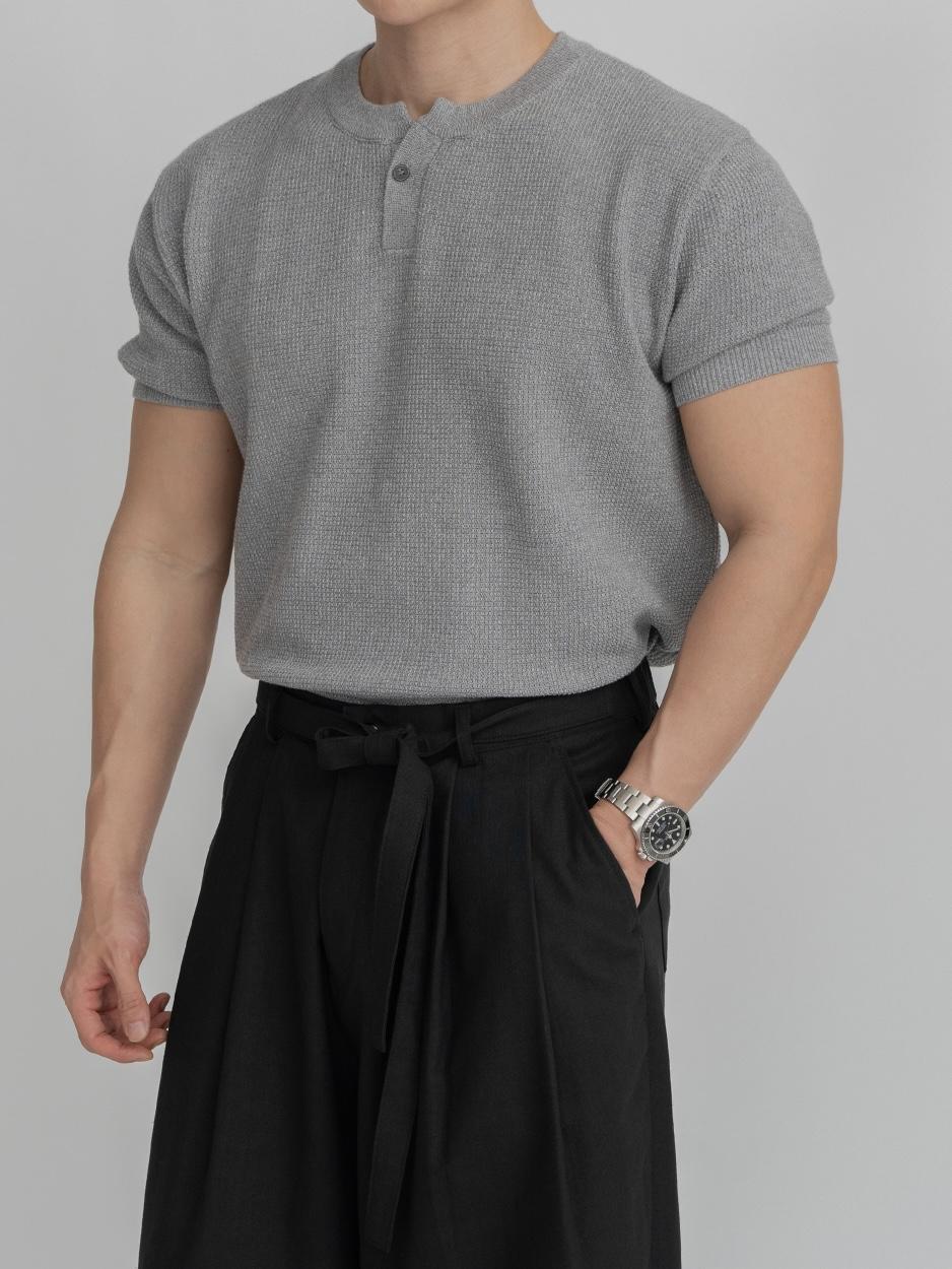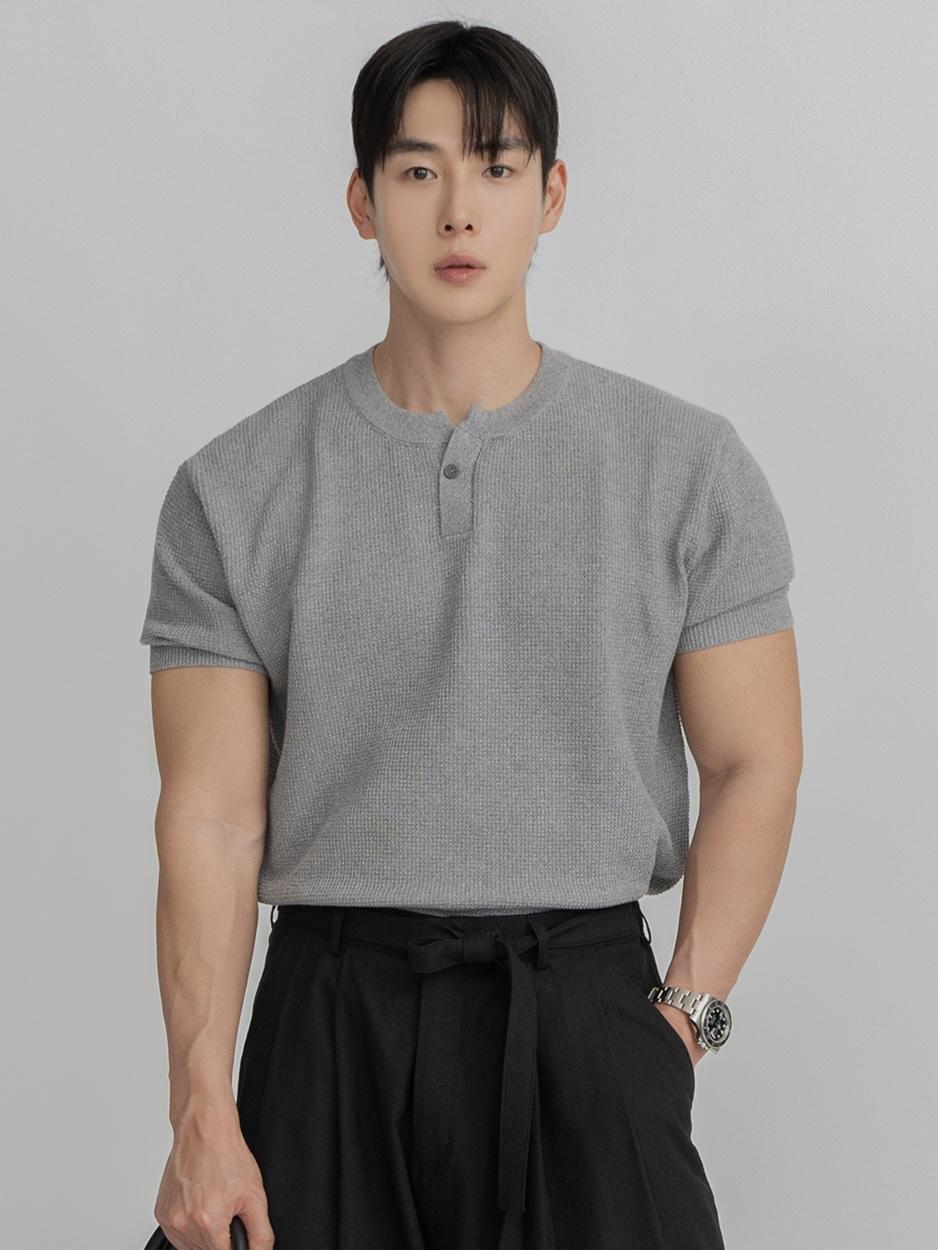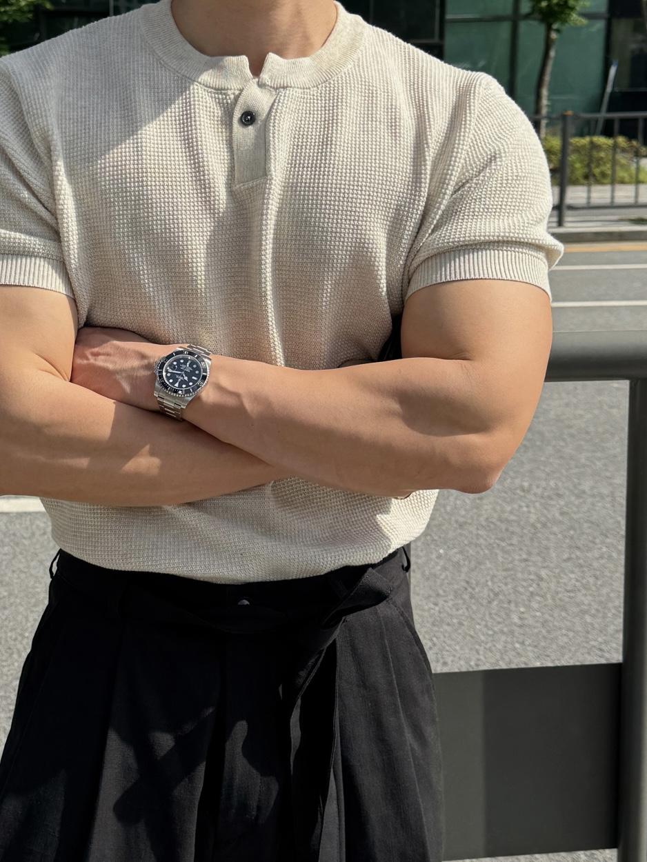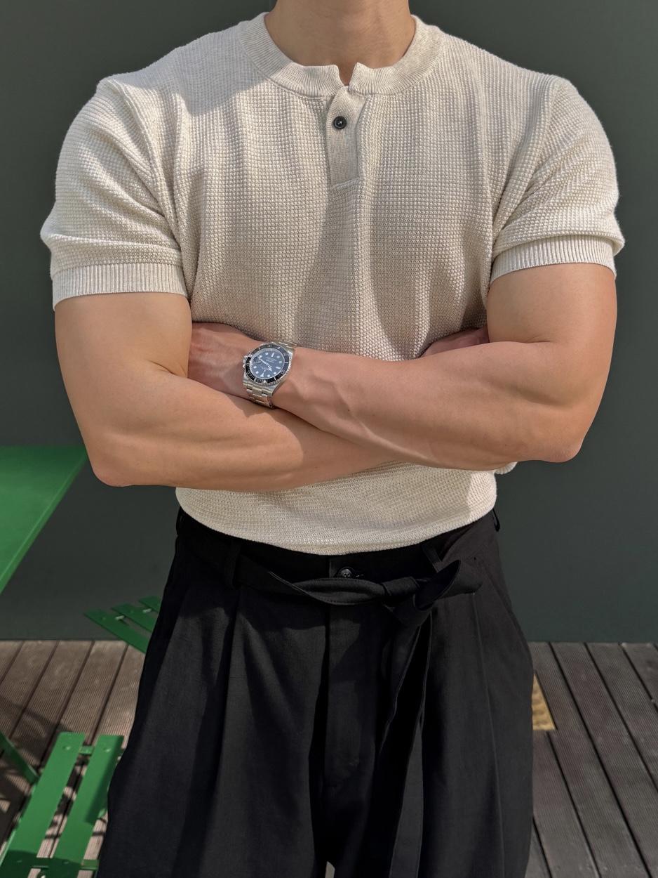 採用棉質和聚酯混紡製成,耐穿不易變形。時髦的單扣亨利領設計,加上螺紋針織細節,非常推薦給喜歡亨利領的朋友們!